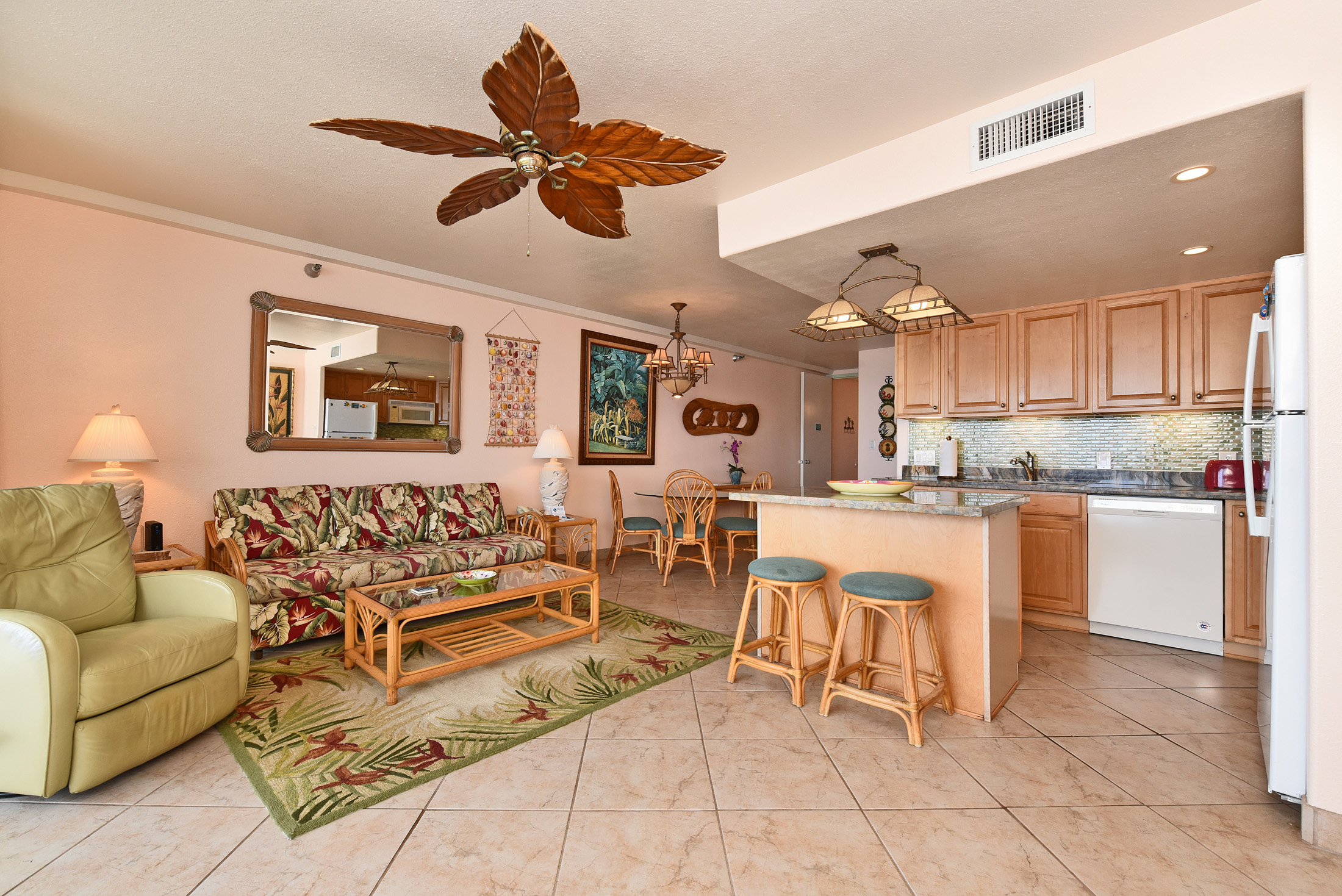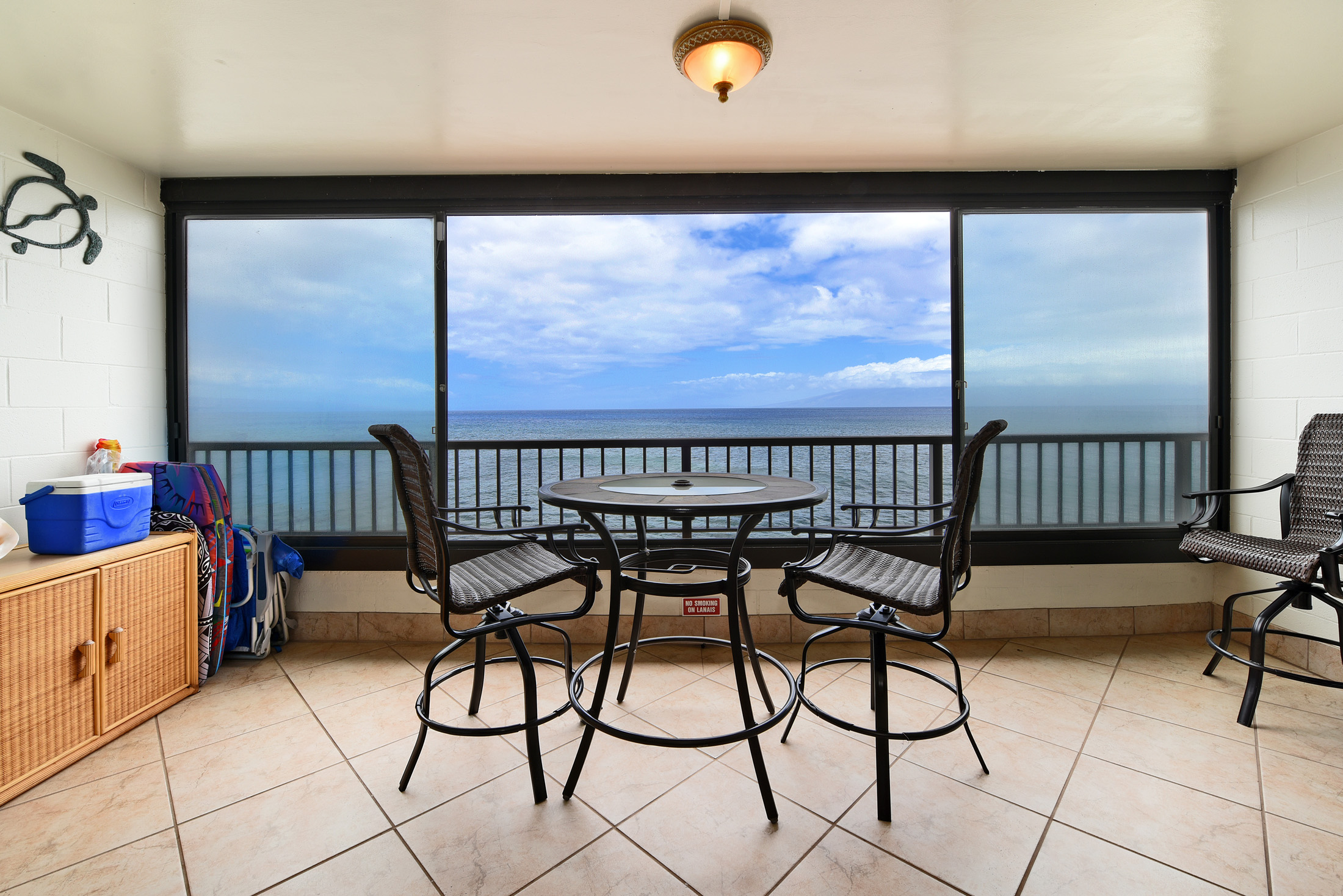Maui Kai 205 is located on the world famous Kaanapali Beach and shores. You can't get any closer to the ocean then the MAUI KAI Resort being the building is just feet away from the ocean and with the best snorkeling right outside the front door. As you relax on the lanai, it's easy to spend hours watching the surfers, windsurfers, parasailing, kayakers, boats, and the beautiful whales. As you enter the condo you will be amazed by the open tropical feeling and panoramic ocean view. This unit is located on the second floor, so if you prefer, you don't have to wait for an elevator. There's ample free parking on the property. The condo has a fully stocked kitchen with granite counter tops and cooking Island , a hotel style safe, high-speed Internet with free Wi-Fi, free local telephone calls, 46' Samsung Flat Screen Cable TV, Sony multi-region DVD Player, IPOD station, radio stereo system. The bedroom has a brand new king size bed on bamboo hardwood floors, and the tiled living room has a queen size sofa sleeper, a very comfortable leather recliner. On the same floor, a laundry room with washer and dryer are available. Beach towels, chairs, umbrella, boogie boards and snorkel gear are available for your use. Restaurants, shopping, grocery and medical are within walking distance. The Boardwalk leading to Duke's Restaurant and Kaanapali's famous Black Rock walk is just a short distance away. Check in 4PM Check out 12PM Registration Number: W76085838-01, TA-107-820-8512-01